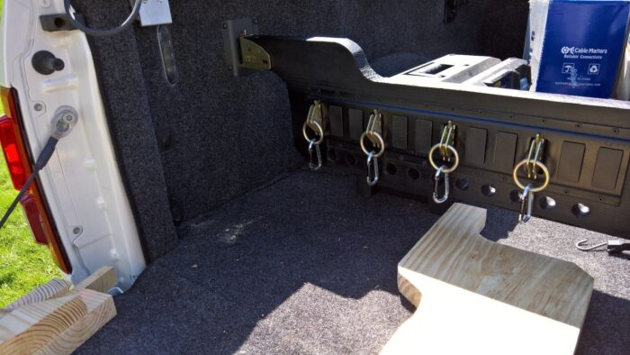 The Bull Ring’s tie-downs are metal hook rings. To these, you can hook the cargo’s retention strap. Also, you can tie off some length of rope.