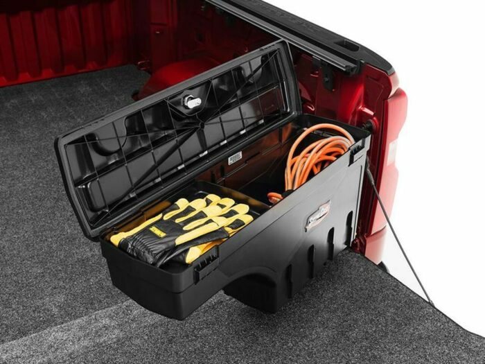 Do you wish that your Ford F-150 has a built-in cargo box for storing small items? The UnderCover SwingCase is a swing-out bin. It mounts on the bed of your truck against one side.