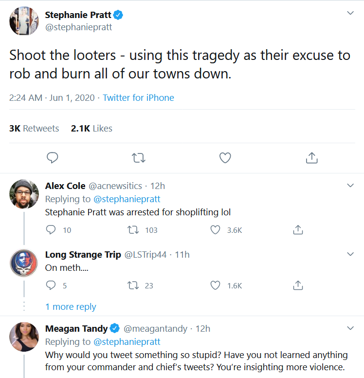 “Shoot the looters — using this tragedy as their excuse to rob and burn all of our towns down” Pratt tweeted on Sunday.