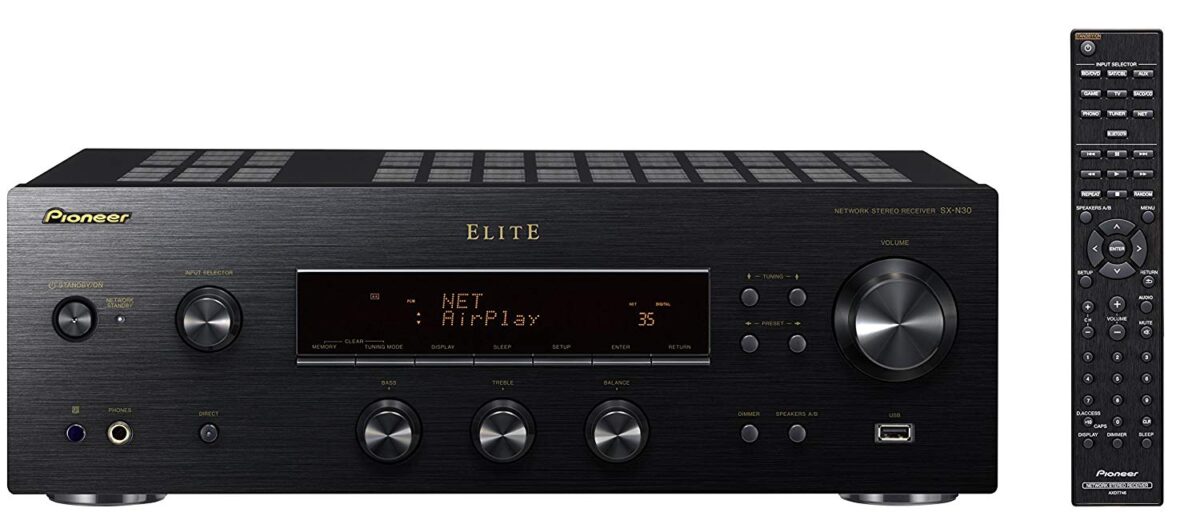 The Pioneer Elite SX-N30 features Wi-Fi connection which works through 2.4 GHz, while the Bluetooth connectivity operates with an SBC codec. This model offers a powerful 2-channel sound, a built-in AirPlay, a USB port, two coaxial, two optical, six RCA, and a dedicated phono input. You can control this amp from an Android or iOS smartphone or tablet via the free app or the SR remote control. Some of its best features include a built-in AM/FM with 40 presets, DLNA & internet music streaming, and up to 80W Per Channel at 8 Ohms. It is a great value for money with its high-end audio and the exceptional convenience of a fully connected unit.