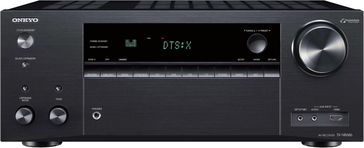 The Onkyo TX-NR686 comes with some of the best characteristics within this price limit. It is the best alternative unit in case the Denon AVR-X1300W sold out or if you don’t need the additional channels and power. This AV receiver offers a decent sound and there is a possibility to add speakers in an additional zone. Additionally, there are two subwoofer outputs and it supports Atmos, DTS:X, and DTS Neural:X surround sound options. There is also a dual-band Wi-Fi, DTS Play-Fi, music, Spotify, airplay, Tidal, Deezer, Pandora, tune in and Chromecast built-in, which allows you to control music playback on your TX-NR686 by voice.