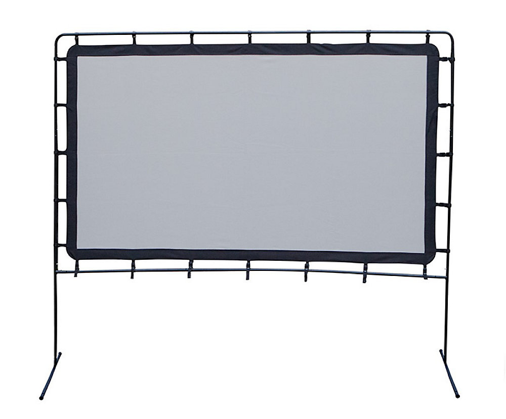 Made from oxford nylon, this screen is very durable and weather-proof. The steel frame seems sturdy enough, but some rope will be needed to avoid moving or tipping over. The screen is suspended with bands, which can take some time to set up. Rear projection can be used on this screen, so if that is an issue, you should avoid it. For under $100, it is one of the best models on the market though.