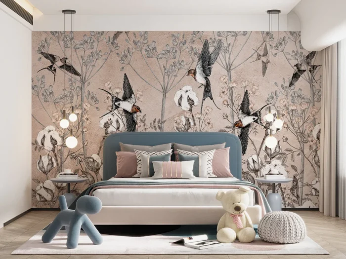 For spacious bedrooms, which exude romance and a relaxed atmosphere, as part of that welcoming, understated ethos – vintage-style wallpapers are perfect. Vintage birds you can find in galleries are a bit crazy – but are ideal for people with a unique style.