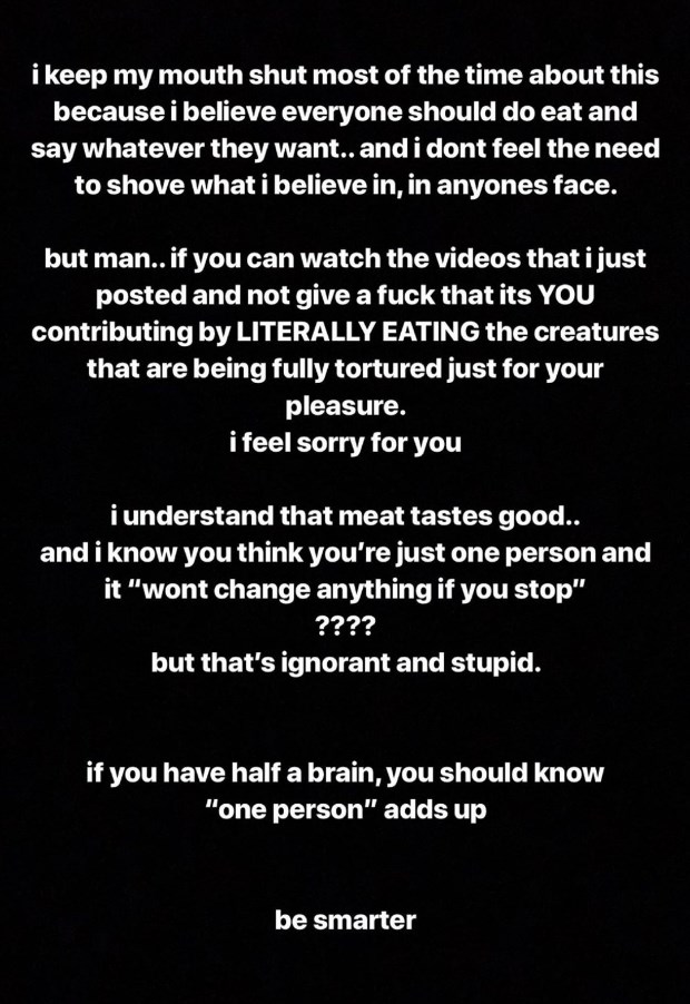 “I keep my mouth shut most of the time about this because I believe everyone should do, eat, and say whatever they want… and I don’t feel the need to shove what I believe in anyone’s face, but man… if you can watch the videos that I just posted and not give a [expletive] that it’s YOU contributing by LITERALLY EATING the creatures that are being fully tortured just for your pleasure. I feel sorry for you.”
