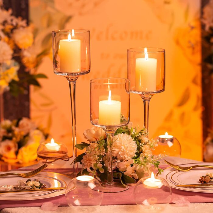 Candles do magic over the entire theme. You can elevate the look by adding steamed tall candle holders on your dining tables. Its stems hold several candles at a time. If you have a large dining table, then it would place them at some distance from each other. You can add more colors with the help of flowers, as you can hang them on the base of the steams. Moreover, these tall candle holders do a great job as they don’t block the view.