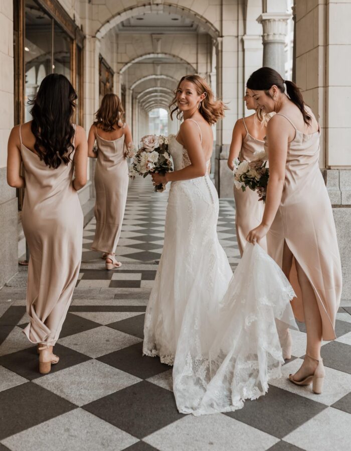 According to Katie and Frances, an appearance that is extremely luxurious may be achieved by contrasting the materials used. “We enjoy accessorizing all of our satin designs with gold jewelry, a charming pearl beaded bag (favourite is this Pearl Bucket Bag by Six Stories), and nude strappy sandals made of suede or leather,”