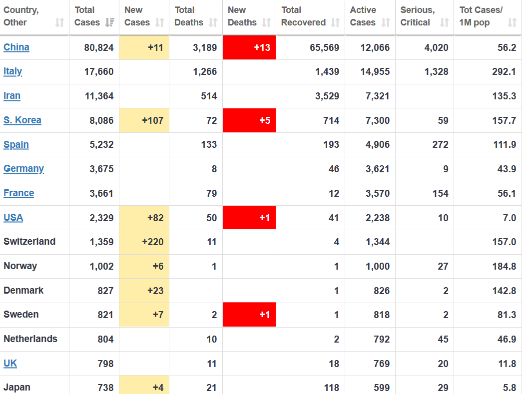 In the US, as of this time, 2329 people are infected, 51 have died and 41 recovered. In Europe, Italy has been hit the hardest with 17,660 cases reported and 1,266 deaths.