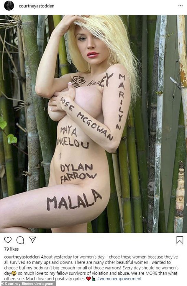 Last week Courtney paid tribute to Malala, Maya Angelou, Dylan Farrow, Rose McGowan, Demi Lovato and others, writing their names on her naked body for International Women’s Day.