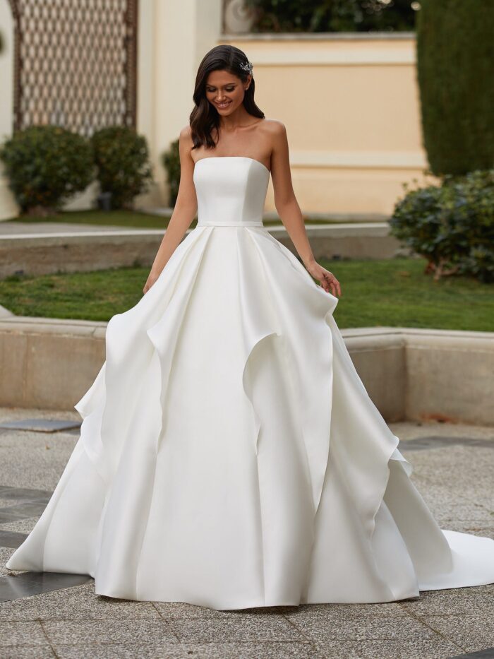 This material can also be used to create unique details, such as pockets or bows, that add personality to the dress. Despite its weight, Mikado is a comfortable fabric to wear, as it allows for easy movement while maintaining its shape. With its sleek and sophisticated appeal, Mikado is a popular choice for brides who want a contemporary twist on a traditional wedding dress.