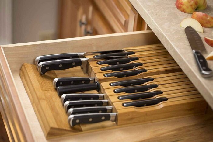 Additionally, this accessory option comes in several configurations, sizes, and colors. In fact, you can also find some with built-in removable cutting boards. Just make sure to measure the size of your drawers before purchasing any cutlery block drawer.