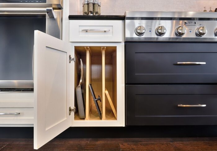 Incorporating vertical dividers in your RTA cabinets is useful for storing ample flat and large objects, such as cookie sheets, cutting boards, muffin tins, baking pans, platters, large lids, and cooling racks. Some cabinets even come with these vertical dividers. In fact, they also give you the option to adjust them according to your needs.