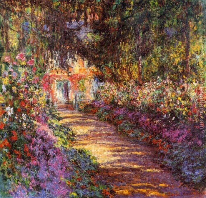 This historic painting shows how Monet’s garden looked 200 years back. With spruce and trees on both sides of the walkway, the vibrant choice of flowers – red, violet and purple on the left and right, made a perfect welcome for any visitor to his house which can be seen right in the end of the walkway.