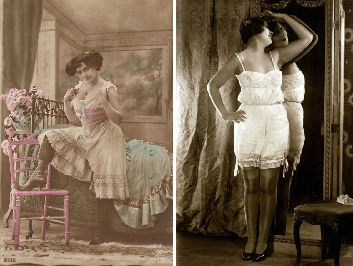 It was the early 1900s that saw lingerie taking form as something deliberately and intentionally erotic. Closed-crotch drawers and open-crotch drawers quickly made their way into the lives of women, with the latter being particularly popular among middle-class women and widely associated with an erotic connotation. Other popular lingerie items from this era included the sheer nightdress, which was considered erotic simply due to the idea that the women wearing it was nude beneath, as well as the slip. The slip was born out of a transition in fashion as designers looked to give women a more boyish look rather than an hourglass figure.
