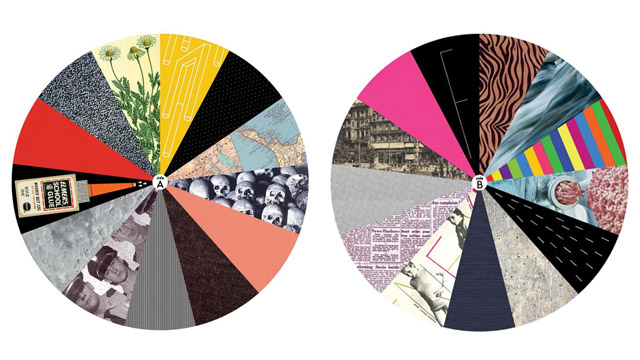 Raymond Biesinger: For sure. As far as the art itself, it’s two circles, one for each side, divided into a couple dozen spots. We requested each band to give us a small amount of words that expressed what the song was about, what the band was about, almost to construct a word totem or a list of icons that encapsulates what the bands and the songs do. That was meant to help me do what I need to do as far as visuals go, and to make it as if the compilation is sort of this empty shell, and the collective identity of the compilation emerges from these individual identities rather than us imposing my style, visually, on the compilation.