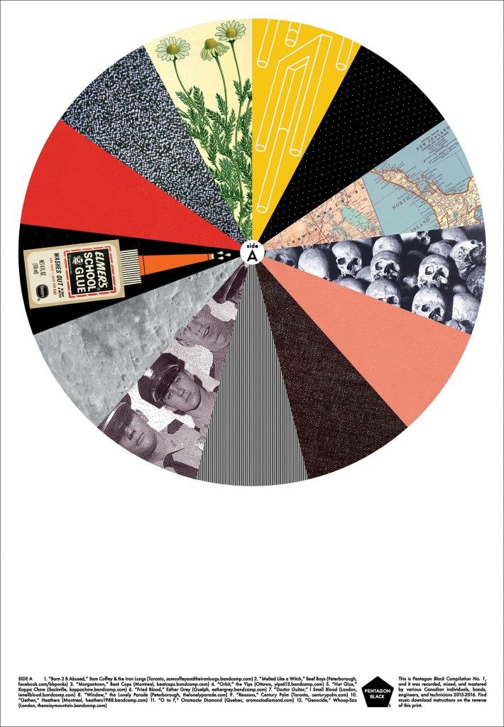 Today, the Montreal punk band’s boutique record label/publishing arm Pentagon Black releases its first compilation. Pentagon Black Compilation No. 1 features original, never-before-heard songs from 23 “DIY-enthused” underground bands across Canada. It’s released on a double-sided 20×30″ newsprint poster with original art by Famines singer/guitarist Raymond Biesinger (one of Canada’s best illustrators) representing each song. Each copy comes with a download code, but it’s not streaming anywhere. In fact, the only way to get it is to show up to one of the participating bands’ shows and buy a copy.