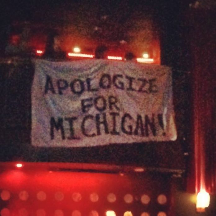 The banner was dropped before the second song of her set. Just before she started to play, it was unfurled and “Apologize for Michigan” was shouted into the crowd. Kathleen Hannah started singing, watching as the security guards quickly tore it down. She did not respond. Not many people in the crowd turned around in time to catch it – the banner was facing the stage, as were the patrons. Those who dropped the banner avoided security and left the Mod Club without a confrontation.”