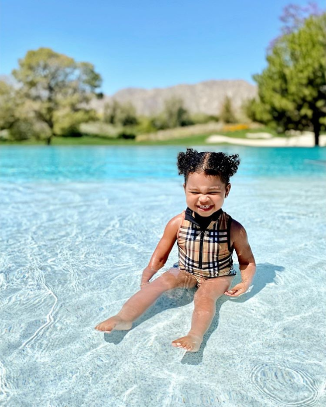 True looked impossibly cute as she donned the sporty swimsuit, which featured Burberry’s signature plaid and lettering on the collar, but some of Khloe’s followers felt that the one-piece was “much too old” for the toddler.