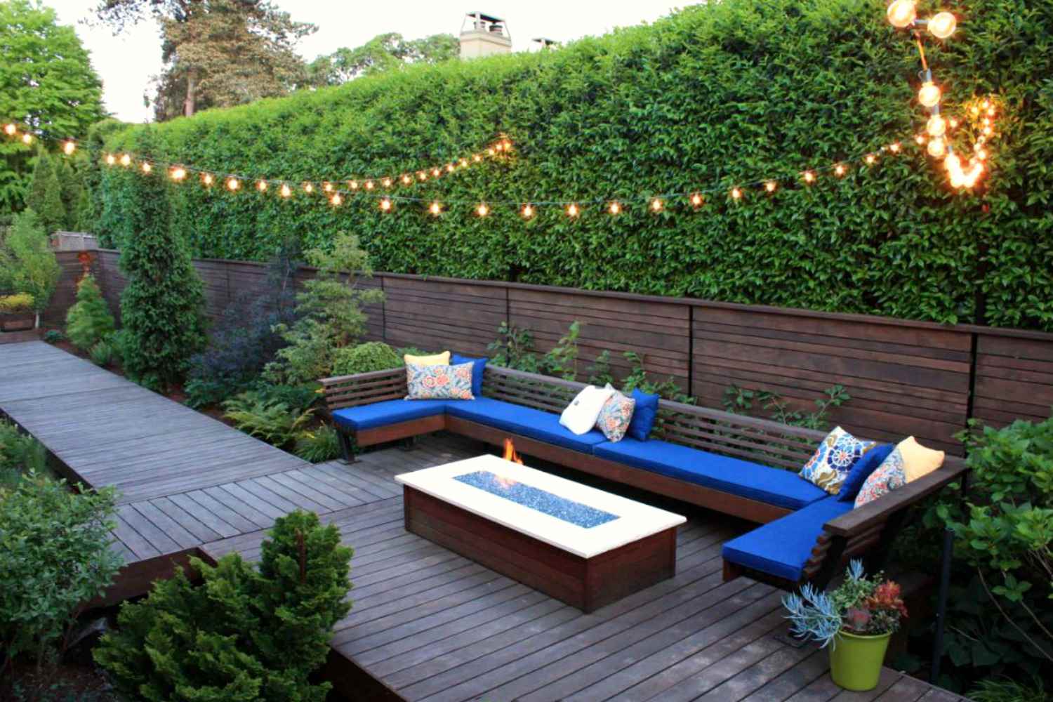 If you’re yearning for a private, cozy outdoor space but your backyard measures around 1,500 square feet, you can easily set up a hot tub with a bespoke, comfy bench, overhead string lights, vertical planting, built-in barbecue, and a fire pit for romantic evening soirées with your loved one.