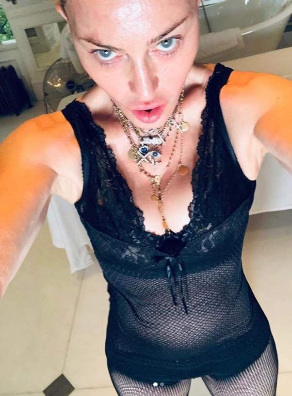 Madonna (61) is very proud of her age-defying physique. The legendary pop star shared a racy pic of her peachy bottom wearing sheer black lace panties. She also shared a photo of her bosoms in a close-up selfie. Singer captioned the photo: “Finally going to get my regenerative treatment for my missing cartilage!! I would be jumping up and down if i could after 8 months of being in pain”.