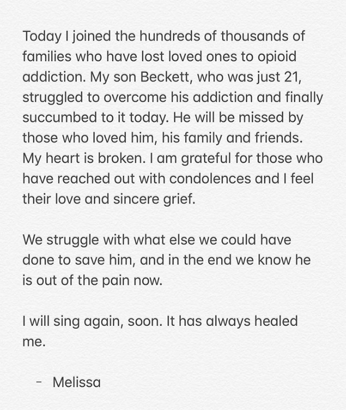 Melissa Etheridge has shared the sad news on social media about her son Beckett, who is one of two children she shares with former partner Julie Cypher.