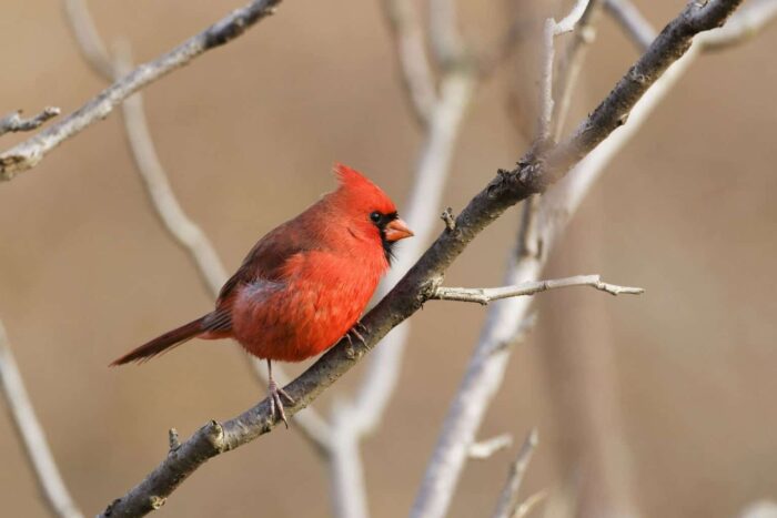 Northern Cardinal – The Northern Cardinal is a large red bird with a black face and crest. It is often seen in gardens and parks, where it feeds on seeds, berries, and insects.
