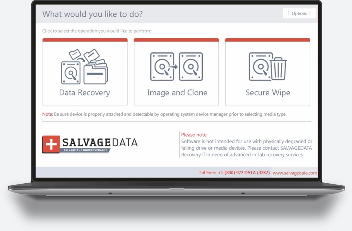 The software tool designed by SalavageData is free of charge and can be downloaded straight from their website. Upon opening the software, we’re met with three options; data recovery, image and clone, and secure wipe option.
