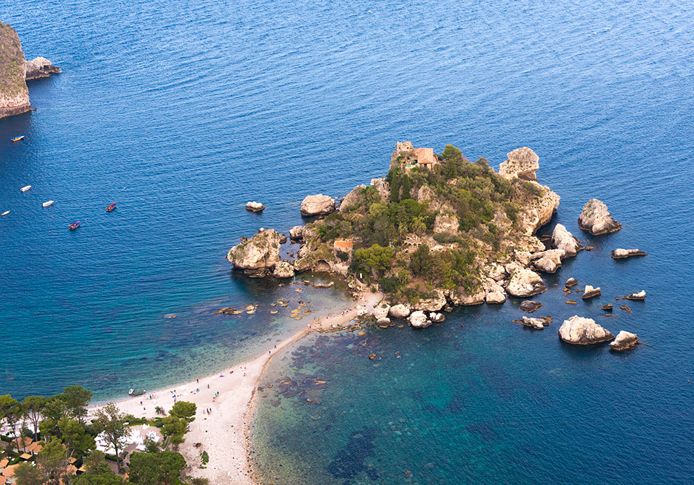 Isola Bella, Taormina, a small mountain separated from the beach by a narrow, shallow waterway, is a must for lovers. Waking up in the morning, a cup of coffee in your hand and admiring the breath-taking view.