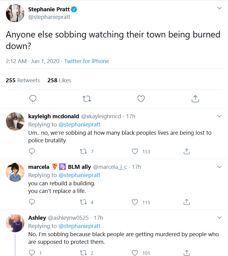 Pratt didn’t stop there, voicing her empathy for businesses more than for slain George Floyd.