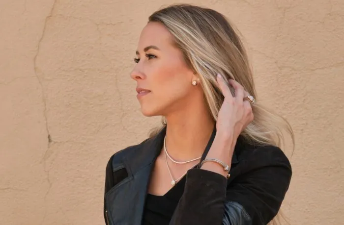 A tennis necklace pairs naturally with structured clothing. Blazers, button-down shirts, and sharp necklines create a clean backdrop that allows the necklace to sit clearly without competing for attention.