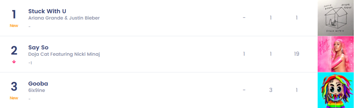 Tekashi 6ix9ine took a shot at both Ariana Grande and Justin Bieber for passing him with their song “Stuck With U”, saying that Ariana’s team used multiple credit cards to get her song’s numbers over the line.