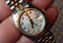 According to the experts from watchshopping.com, if you love mixing silver and gold jewelry pieces, this certified pre-owned watch has stainless steel, 18K yellow gold band that will provide you with that elegant touch. The face of the watch has a yellow gold fluted bezel, and the champagne dial will also tell you the date.