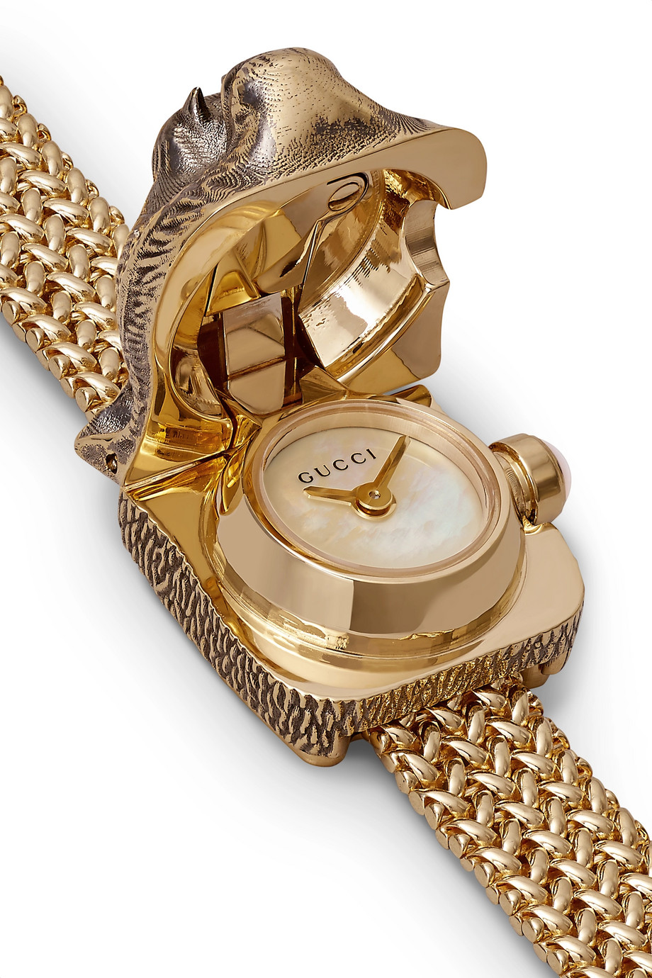 If you want to disguise the watch face, this luxurious “secret” watch from Gucci will fit your collection perfectly. The mother-of-pearl dial is silently hiding behind the feline head and it is only unveiled if you slide the cat’s head to the right. With .146 carats of sapphire crystals, diamonds, and attractive yellow gold color, this is a one-of-a-kind watch.