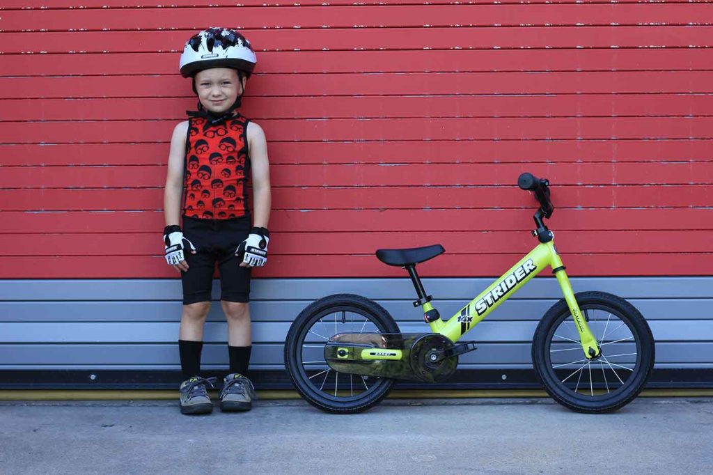 To know if you have chosen the right bike size, the child’s elbow should have a small bend when holding the bars. Their legs should be almost fully extended when their pedal is at the 6 o’clock position for a balance bike with pedals or comfortably touching the ground for bikes without pedals.