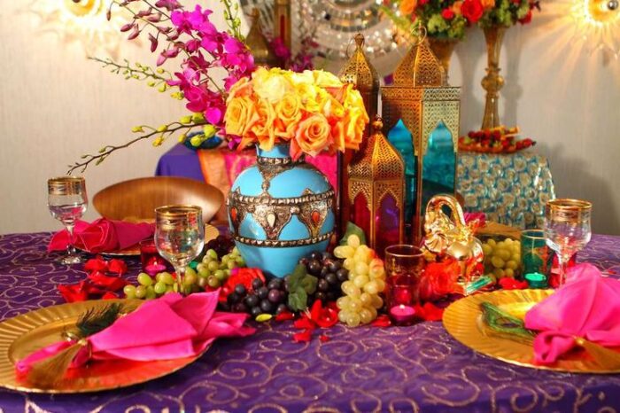 Imagine an evening under the stars, with luxurious fabrics, lanterns, and a palette of gold and jewel tones. This theme evokes the mystique of ancient Arabia, with its rich cultural heritage and enchanting tales. Your guests will feel like they’ve stepped into a scene from “One Thousand and One Nights,” complete with belly dancers and fragrant spices filling the air.