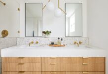 Switch out your bathroom hardware for something with more style – stylish handles and pulls are available in an assortment of materials, finishes, and colors, mimicking beadboard or shiplap design elements. Or, for an instant upgrade at a low cost, replace the builder’s grade mirror with an impressive DIY frame; it will make a noticeable difference to the space!