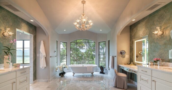 Light up your bathroom while adding style. Choose a chandelier to give an airy atmosphere over the tub, or install LED vanity lights to illuminate mirrors with flattering lighting effects. Dimmable bulbs allow you to set an ambiance conducive to relaxation or grooming tasks during nighttime use, respectively.